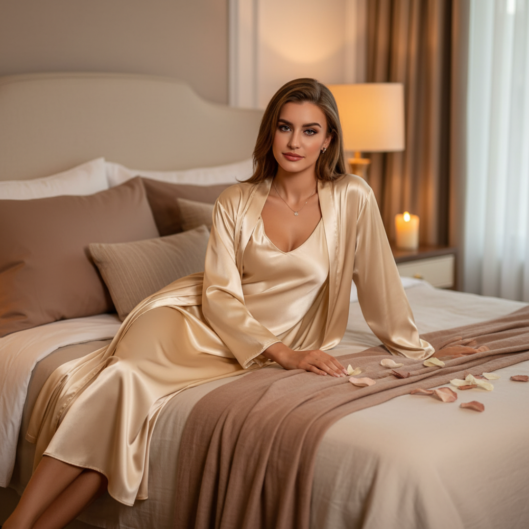 Met de Noctéra Satin Edition kies je voor pure verfijning: een stijlvolle loungewearervaring waarin comfort en schoonheid moeiteloos samenkomen.